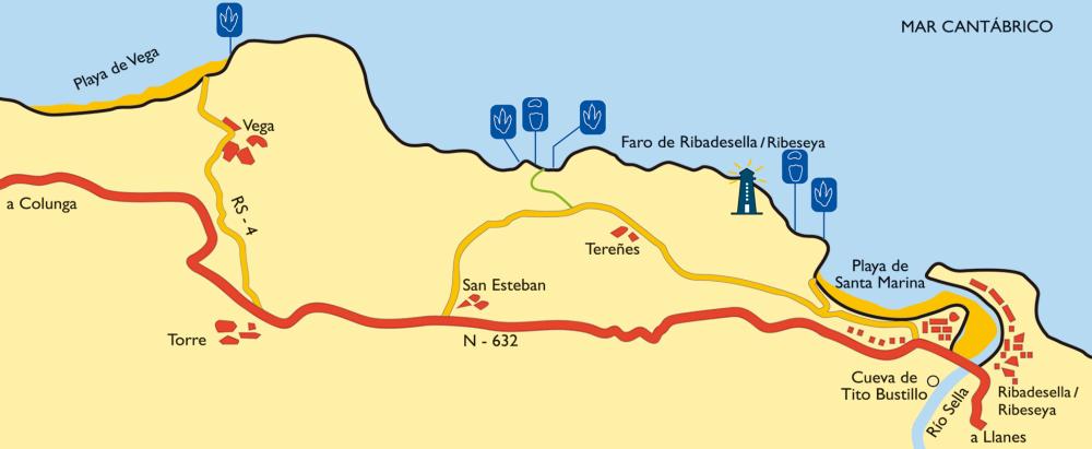 This route begins on the promenade at the west end of Santa Marian beach, where the information panel stands. If we look southwards, we will see some grey limestones from the Carboniferous Period which stick out on the relief as a vertical wall. This wall rougly coincides with an important fracture known as “Ribadesella/Ribeseya Fault”, which runs through the inner part of the town and borders the Jurassic rocks that extend from here to the coastal cliffs.