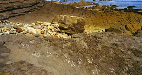 Caminando ahora hacia el oeste unos 300 metros, se accede  a unos estratos de arenisca gris inclinados 24º, sobre los que se encuentran varias icnitas tridáctilas y un rastro de saurópodo, este último bastante desgastado por la erosión marina.
